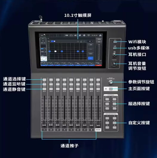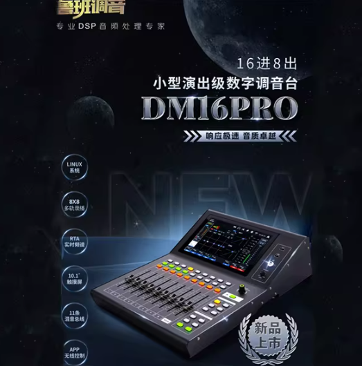 DM16 PRO是佛山慧明(HMAUDIO)推出的国产中高端数字调音台,主打16 路话放 + 10.1 寸大屏 + 内置 88 声卡 + WiFi 远程控制,定位小型演出、会议、直播、录音定位:16 路全能型数字台,兼顾现场、会议、直播、多轨录音核心卖点:大屏触控 + 内置 88 声卡 + WiFi 远程 + 场景记忆 + 低底噪二、核心参数(2026 官方)1. 通道与 I/O(最关键)输入(2