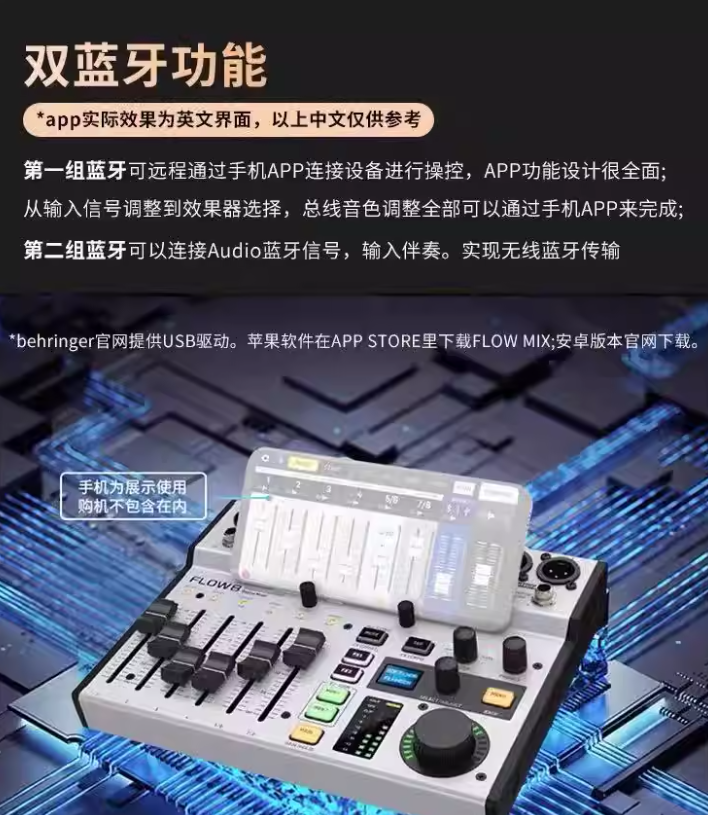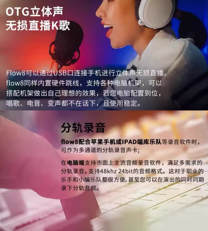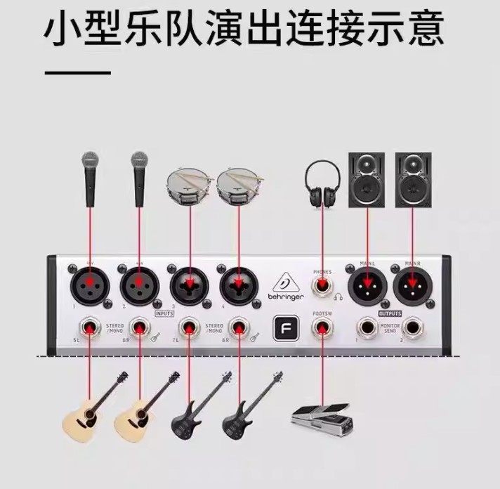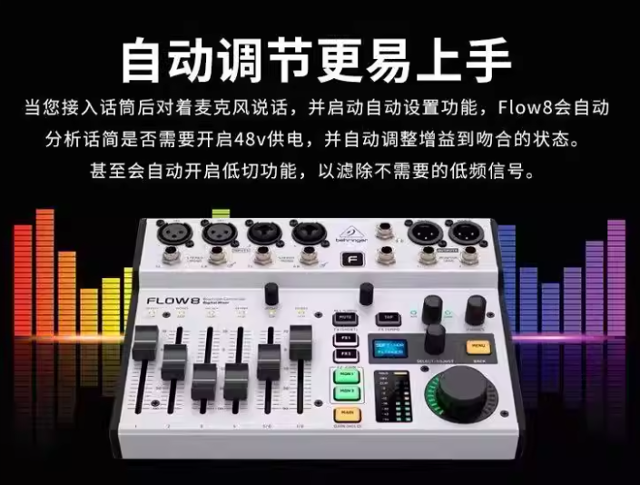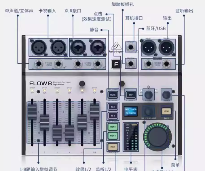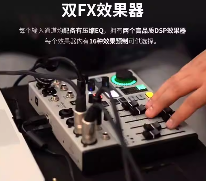 核心规格与接口输入配置:共 8 路模拟输入;2 个 Midas 高品质话放(XLR,+48V 幻象电源),2 个 Combo(XLR/TRS)话放 / 线路,2 组立体声线路(含 Hi‑Z 口,可直插电吉他 / 贝斯);支持 EZ‑GAIN 自动增益,一键设置最优裕量。输出与母线:主输出为镀金 XLR 立体声;2 路平衡监听输出(TRS);1 个 1/4 英寸耳机口;2 路 FX 发送、2 路监听