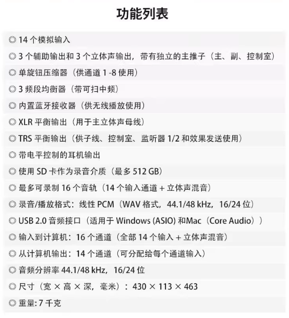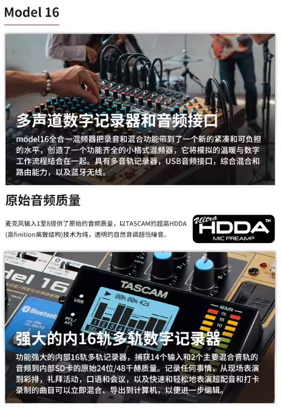 Model 12(紧凑型桌面)12 通道多轨 SD 录音(48kHz/24bit),12 进 10 出 USB 音频接口;Ultra-HDDA 分立话放(56dB 增益),多通道支持高阻乐器输入;带 MIDI、蓝牙;适合播客、单人 / 小型乐队、多媒体制作。Model 1616 轨 SD 多轨录音,16 进 14 出 USB;14 路模拟输入(10 单声道 XLR/TRS,2 立体声对);10 路